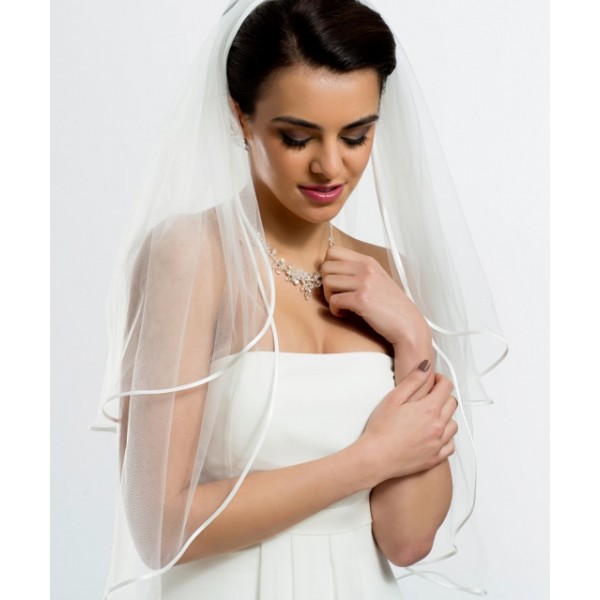 Popis produktu- svadobný závoj- saténový lem- dostupný v bielej a ivory/smotanovej farbe- 2-vrstvový- začesáva sa na hrebienokZloženie-jemný tyl /soft/ Dĺžka-80cmKód produktuS20